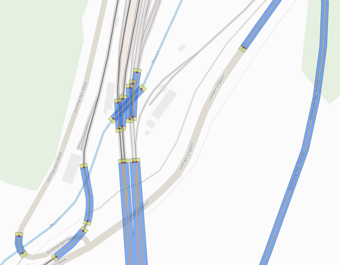Abbildung 2: Geometrien der Tunnel/Brücken-Netzwerke aus OSM-Daten: Blau: Netzwerk-Polygon. Grün: Eingangs-Polygon. Rot: Eingangs-Punkt. Orange: Liniengeometrie mit interpolierten Höhendaten.
