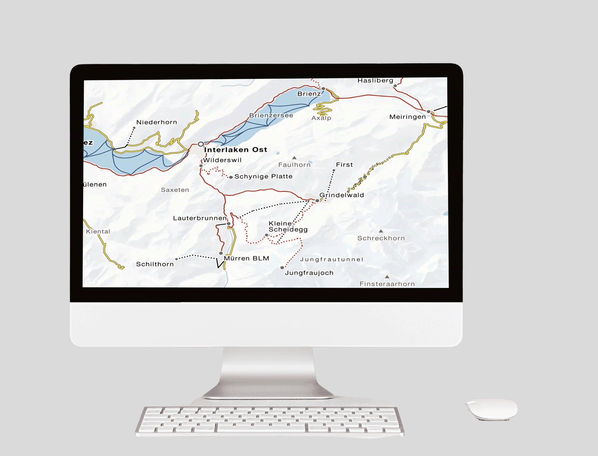 Damit die komplexen Abo-Gültigkeitsinformationen aus NOVA für alle verständlich und nutzbar werden, verbindet geOps Datenkompetenz mit präziser Kartografie. Herzstück ist unser topologisch korrektes ÖV-Streckennetz mit detaillierten Linienverläufen und Haltestellen in verschiedenen Generalisierungsstufen. Aus den in NOVA hinterlegten Tarifkanten – definiert durch Start- und Endhaltestellen – erzeugen wir mithilfe unserer eigens entwickelten Routing-Engine präzise Linienführungen. Ergänzend kommen Heuristiken zum Einsatz, um Sonderfälle wie unterschiedliche Stationsnummern, Flughafenbusse oder grenzüberschreitende Verbindungen korrekt darzustellen. So können auch Detailunterschiede, etwa im Jungfrauraum oder bei touristischen Bergbahnen, zuverlässig abgebildet werden. Für besonders komplexe Fälle, wie saisonale Sportbusse oder Richtungseinschränkungen auf dem Bodensee, weist die Karte bewusst neutrale Darstellungen mit entsprechenden Hinweisen aus. Das Ergebnis ist eine intelligente Verschmelzung von Datenmodellierung und Kartengestaltung, die selbst komplizierte Tarifszenarien übersichtlich visualisiert. Die Datenintegration und Publikation als Vector Tiles ist mit Pipelines komplett automatisiert, so dass sie mehrmals jährlich aktualisiert werden kann.